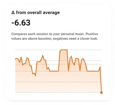 Session summaries turn raw scores into clear trends, showing your consistency, average scores and personal bests over time.